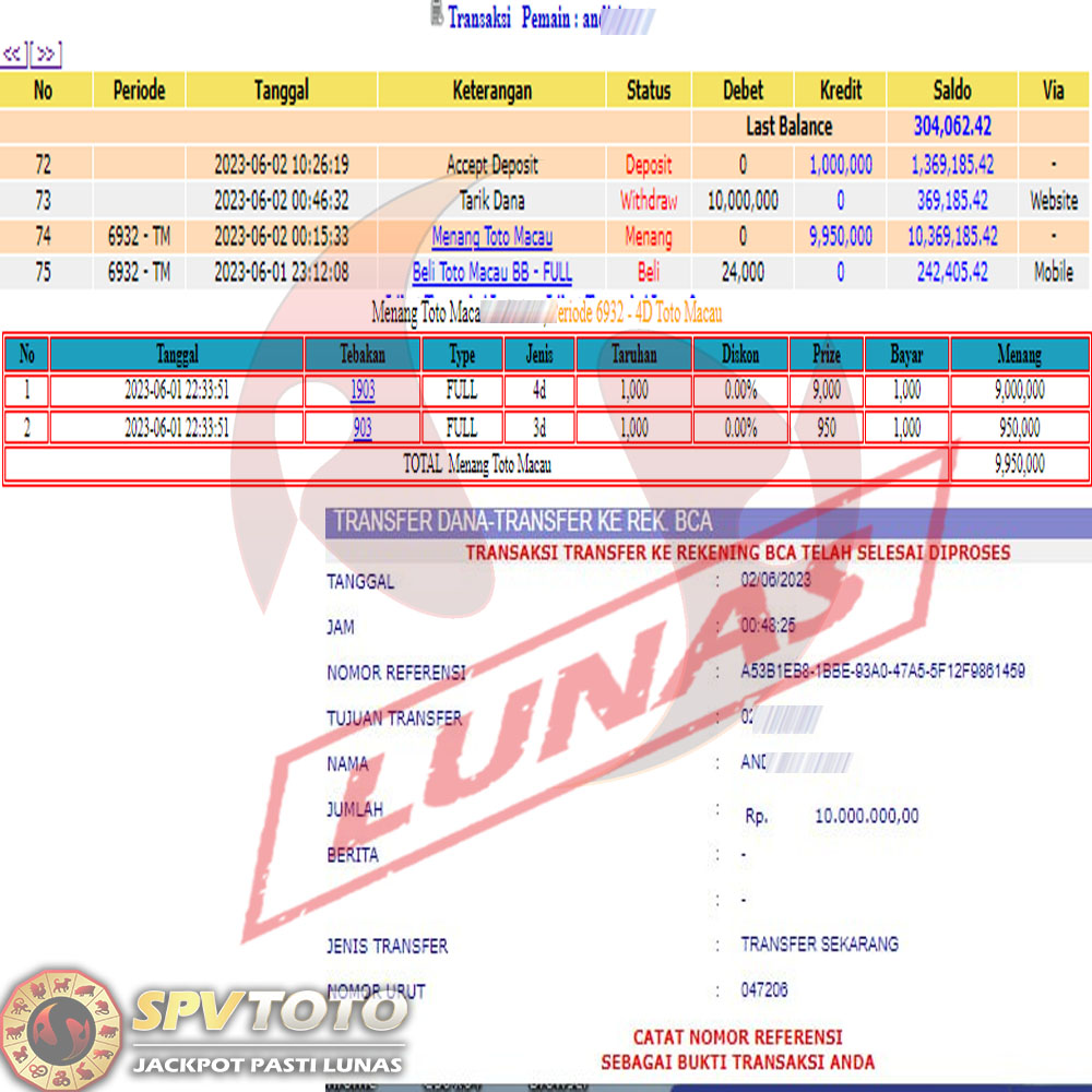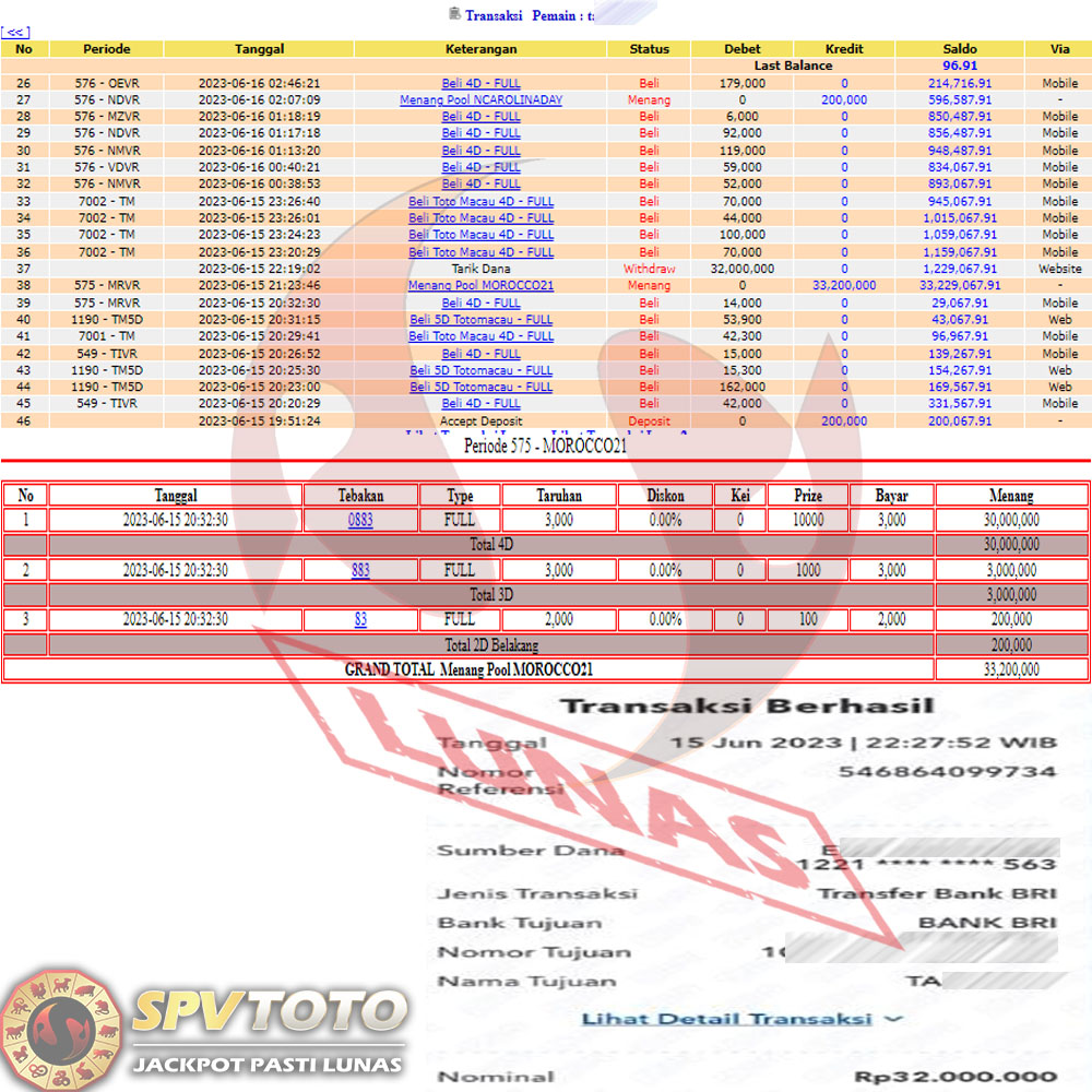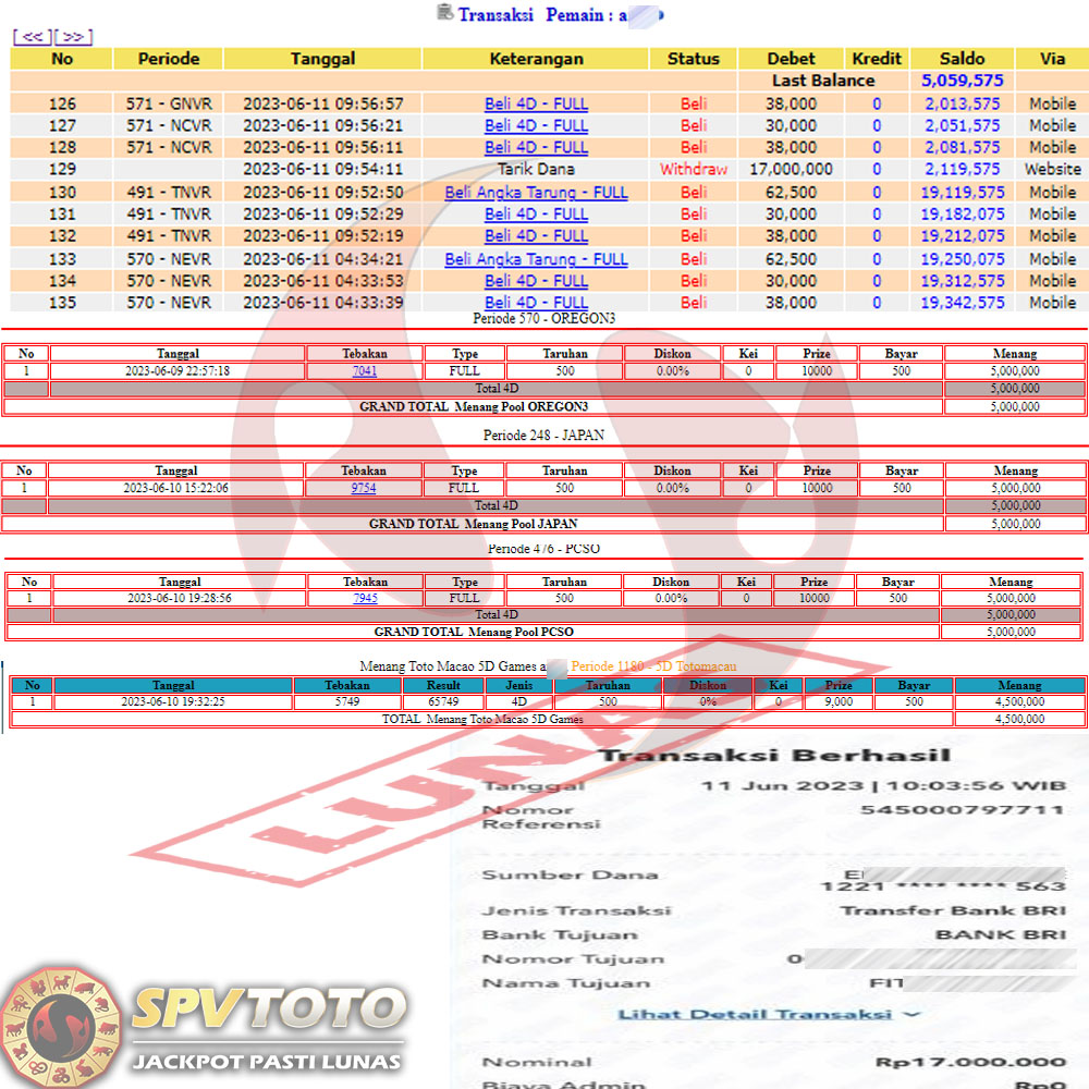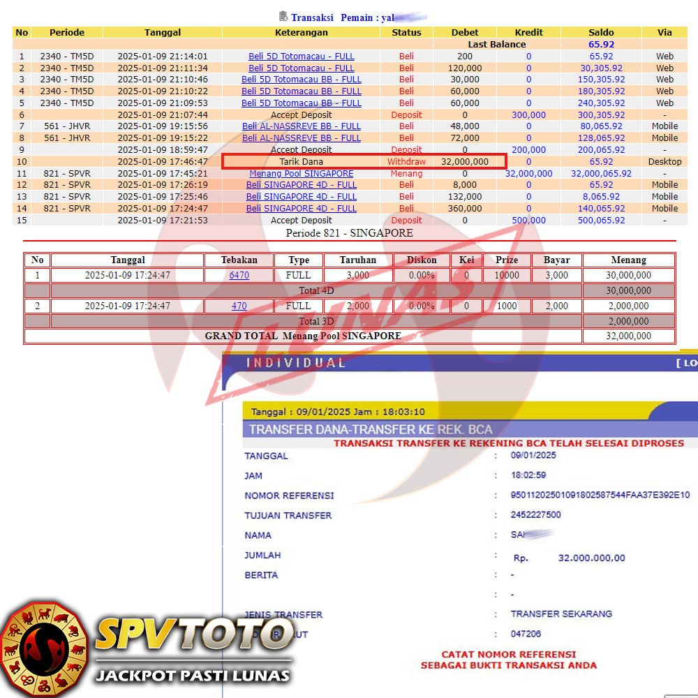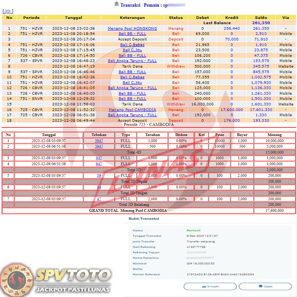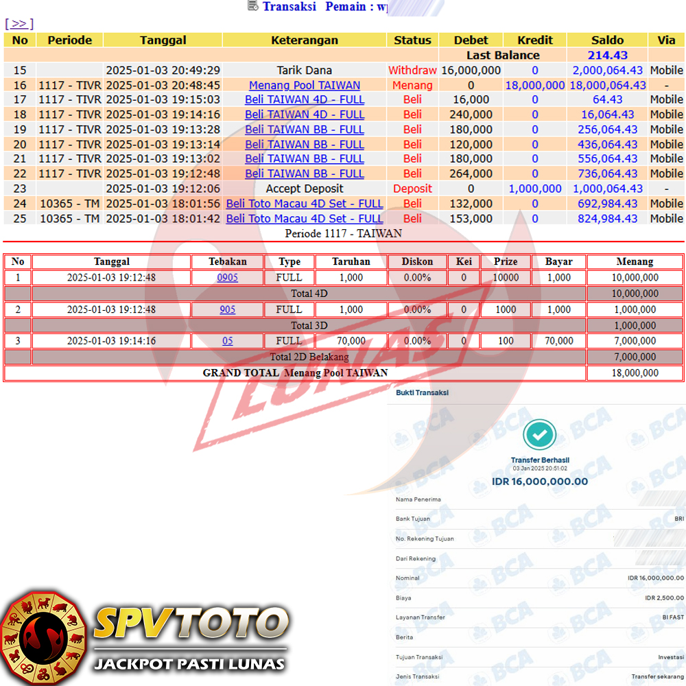 SELAMAT KEPADA MEMBER YANG MENDAPATKAN JACKPOT DI SPVTOTO