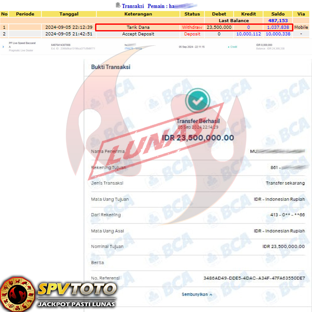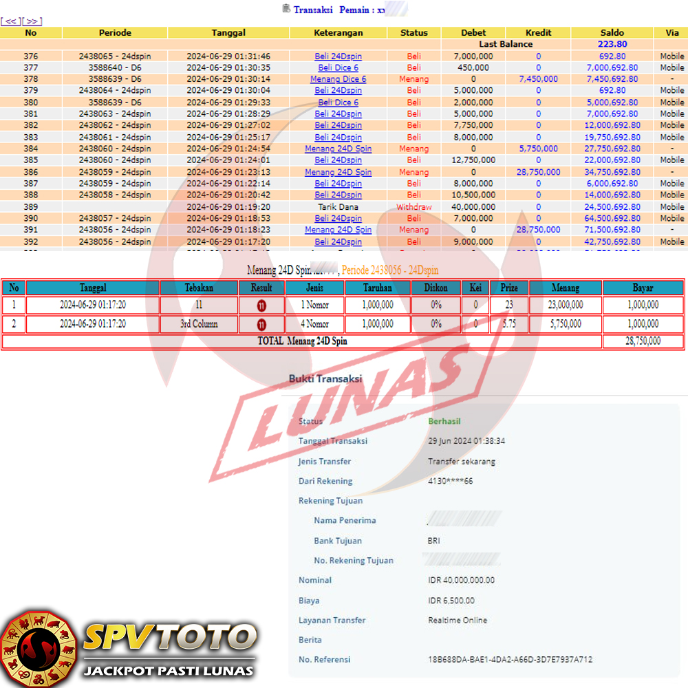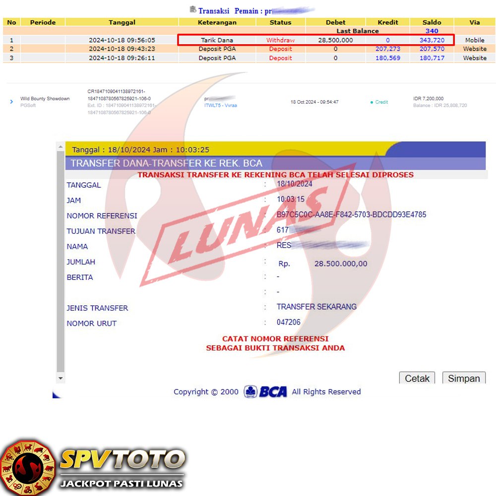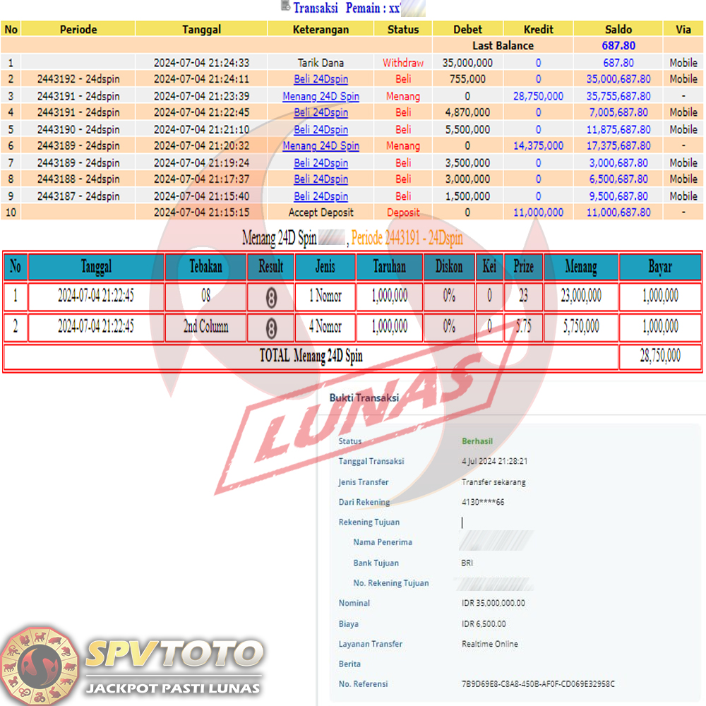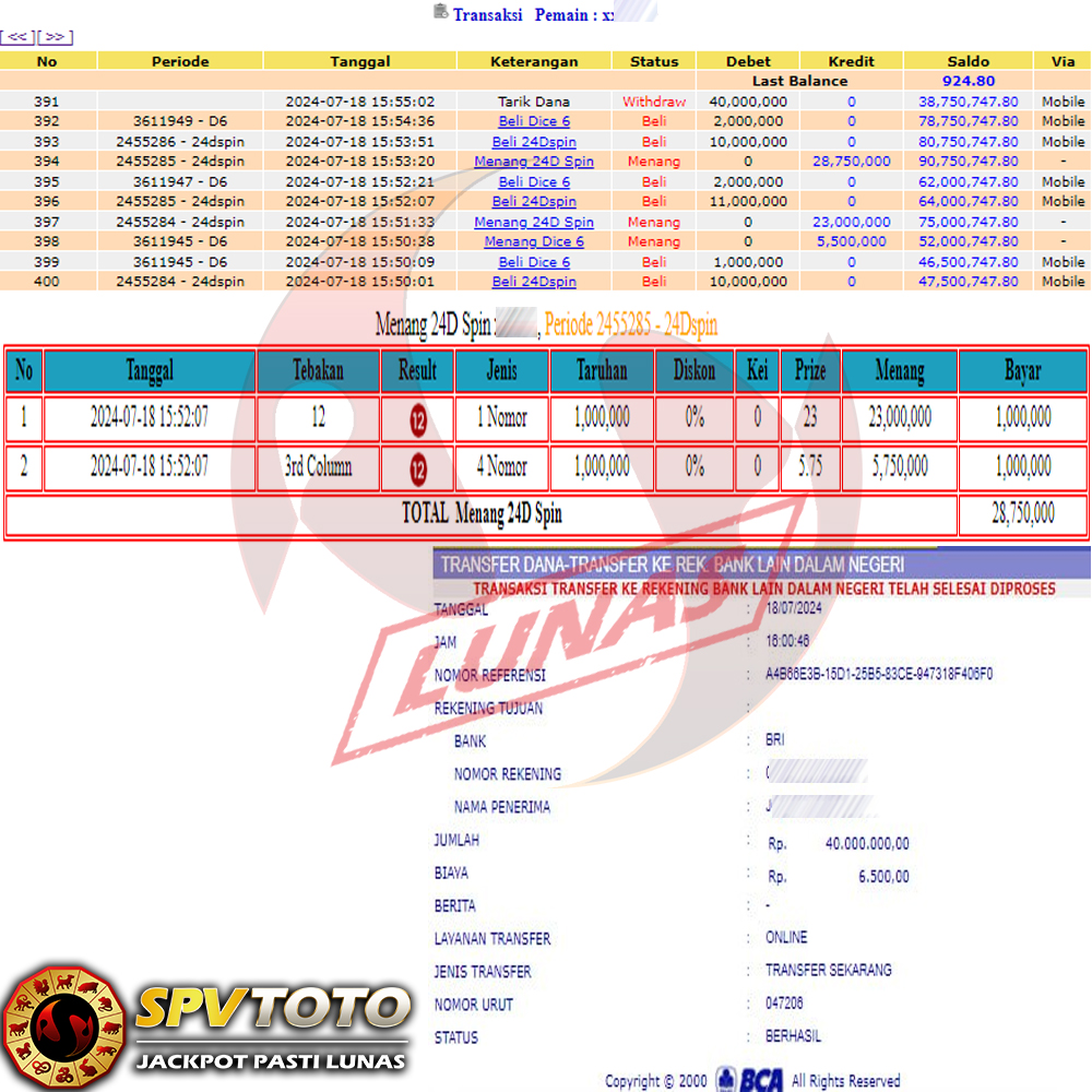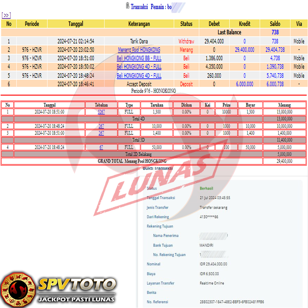 TRANSFER TELAH DI PROSES !! DAN MENDARAT MULUS KE REKENING ANDA YAH BOSSKU , WD BERAPAPUN DI SPVTOTO DI BAYAR LUNAS !! TANPA BASA BASI!!!